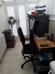 This is a post I’ve been meaning to write for some time. It’s now eight months since I moved house and I’ve set up an office in the back of the house so I thought I’d share some pictures with you. The room is actually a small conservatory which was lovely and cosy in the winter but has been too hot in the current climate. Fortunately I’m on Google Drive so I’ve been able to upload my work to the cloud and work on my laptop in a cooler part of the house.